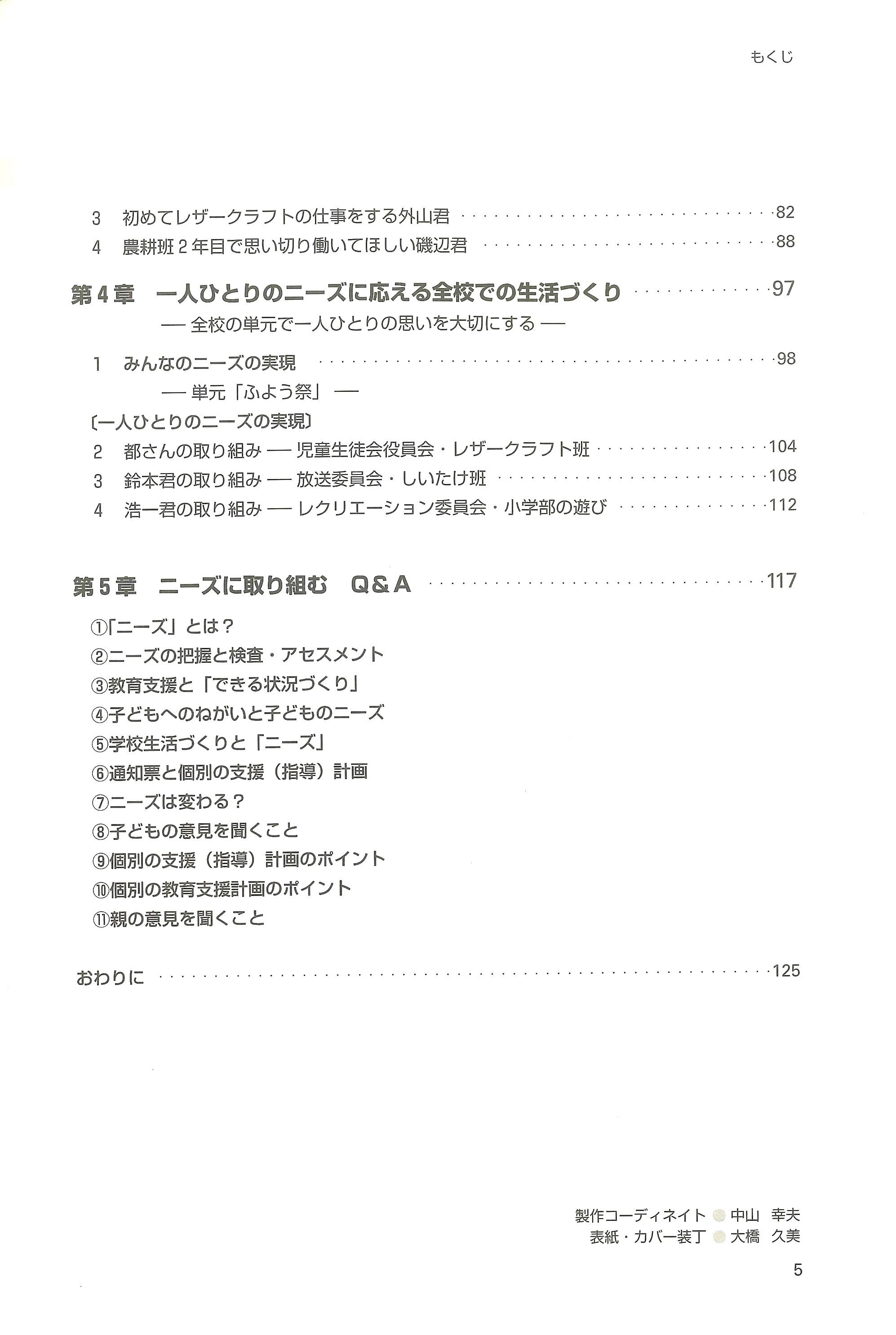 本書では、一人ひとりの子どもの思いを大切にして、本校がそれぞれの単元や個々の活動をどうつくるのか、本校実践の1ステップ、1ステップを示そうとしました。子ども本来の「ニーズ」のこたえる取り組みを通して、子ども一人ひとりが力を発揮し、思いも実現し、日々が充実して満足する、そのための手段や歩みを、順にわかりやすく表したいと考えました。